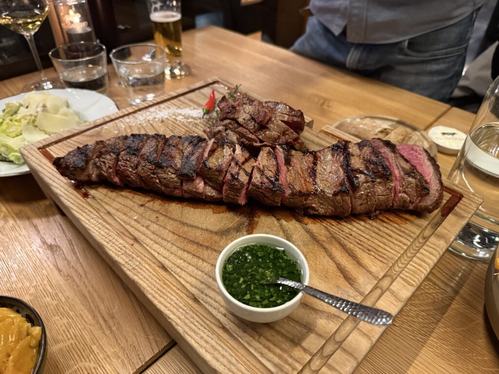 木のボードに乗せて提供されたステーキは、外側が香ばしく焼かれ、中はジューシーなミディアムレア。肉の旨味がしっかり感じられる満足度の高い一皿でした。