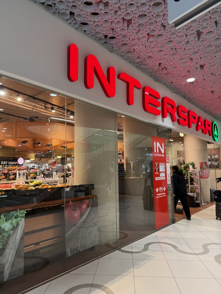 旅行中にぜひ立ち寄りたいのがスーパーです。今回訪れたINTERSPARはオーストリアの大型スーパーマーケットで、食品の種類がとても豊富でした。街中を歩いているとあちこちにあります。こちらは駅中の大きな店ですが、コンビニがあちこちにありますが、日本ほどたくさんあるわけではないので、ホテル近くの場所を確認しておくのがベターですね。